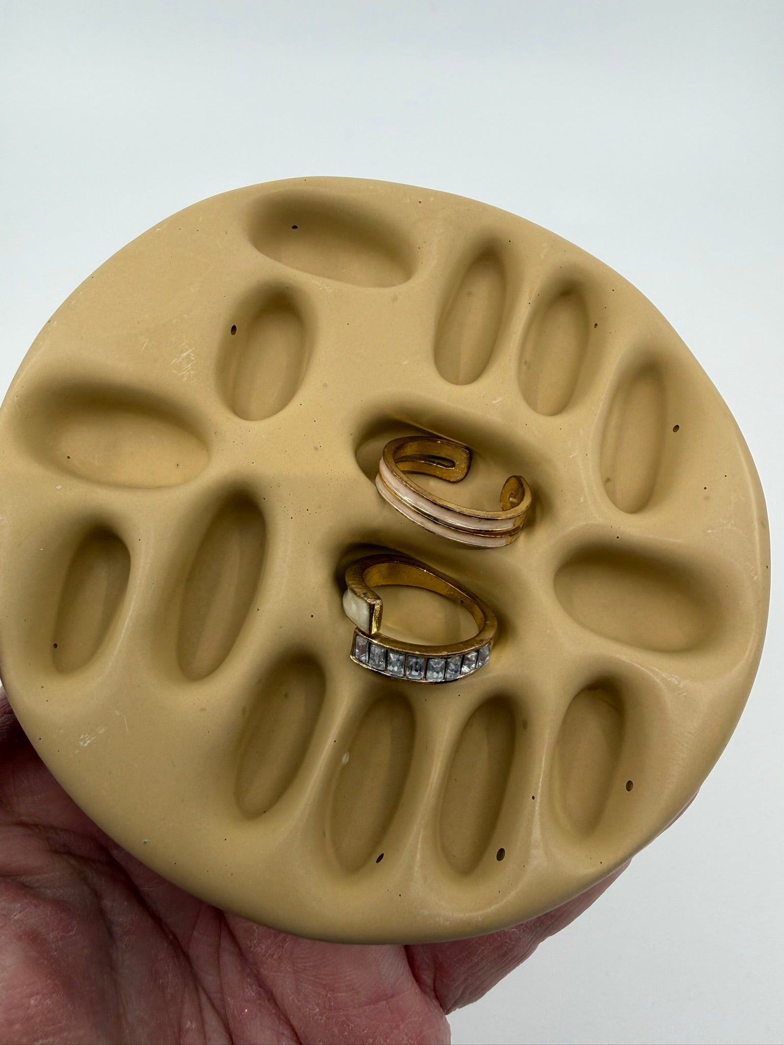 A sculptural ring dish featuring an organic crater-like surface designed to hold rings and small jewellery pieces. Each piece is hand-cast from jesmonite and designed to keep multiple rings safely in place.