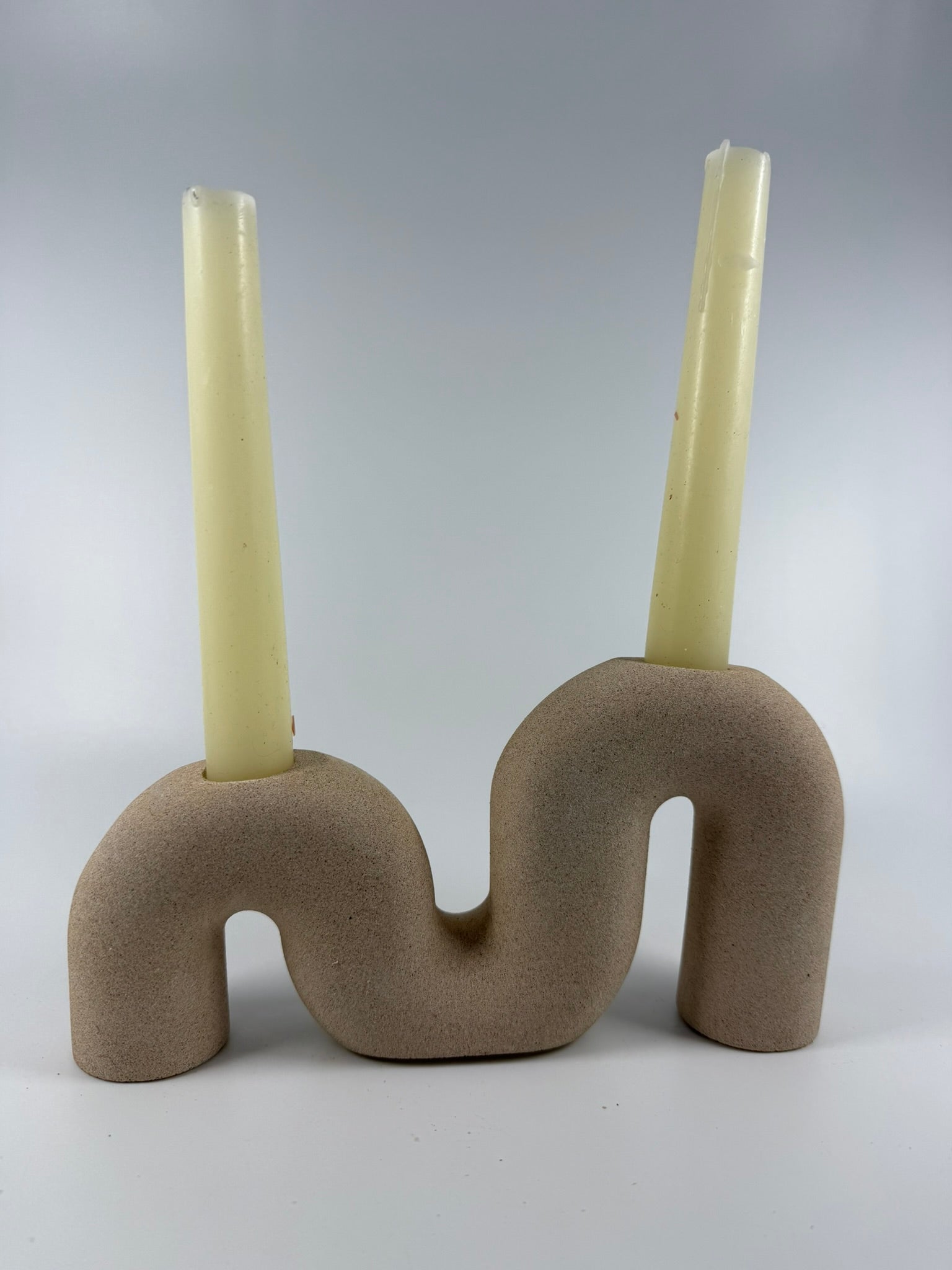A sculptural candle holder with a soft, flowing shape designed to hold standard taper candles. Hand-cast from jesmonite, its curved form creates a modern decorative accent for shelves, dining tables, or styled displays.