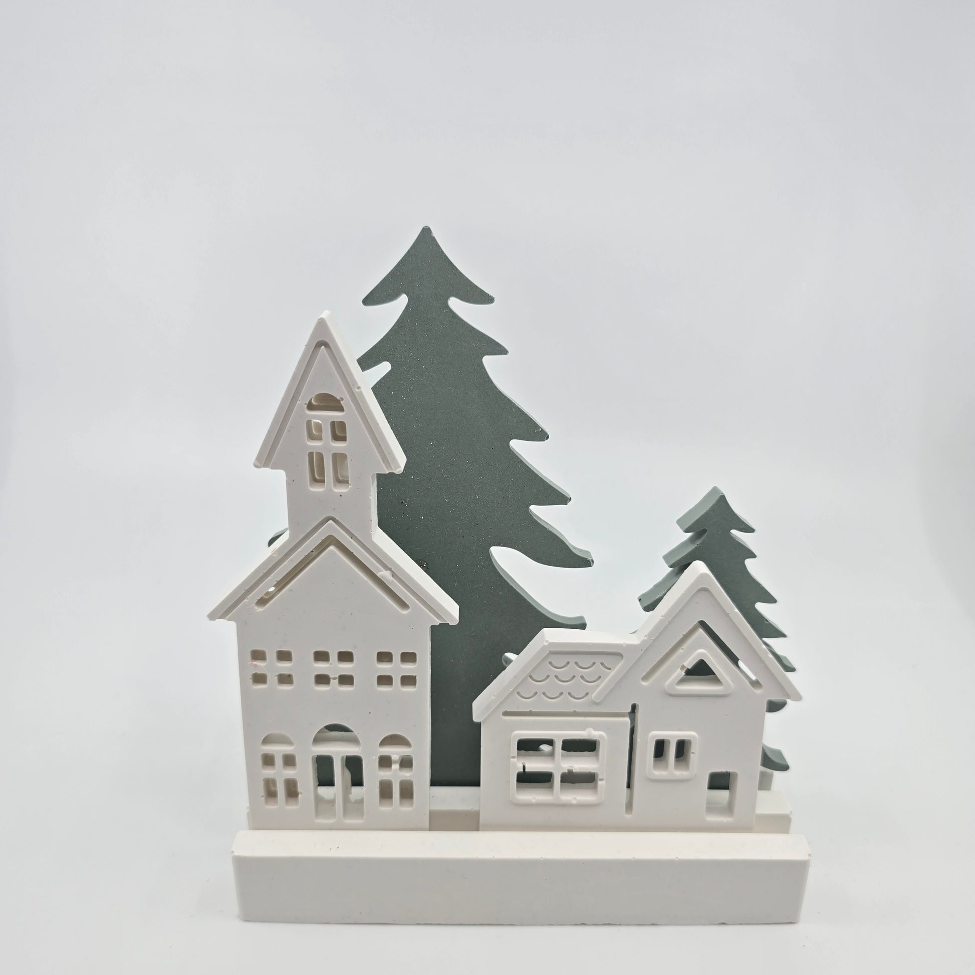 Charming village and pine tree decorative piece, perfect for adding a festive winter atmosphere to your home. Due to the presence of small air bubbles formed during production, this item is offered at a special discounted price.